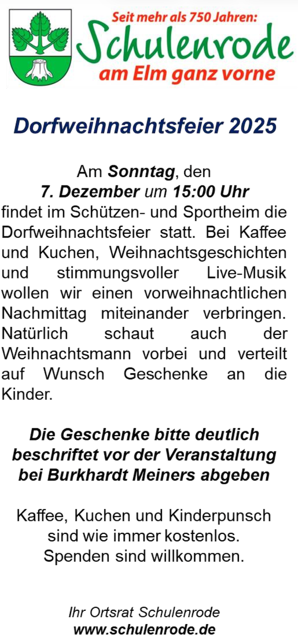 Schulenrode ist für mich...der Ort mit dem ich mich durch Freunde, Familie und Vereine immernoch verbunden fühle.Herzlich willkommen in Schulenrode!Auf unserer Website erfahren Sie zwar nicht alles, aber ziemlich viel über unser nettes kleines Dorf. Nur damit Sie schon mal Bescheid wissen, sollten Sie zwischen Cremlingen und Abbenrode einmal versehentlich oder bewusst rechts abbiegen. Seien Sie herzlich willkommen: Hier im Internet oder - noch lieber - persönlich bei uns am Elm ganz vorne.